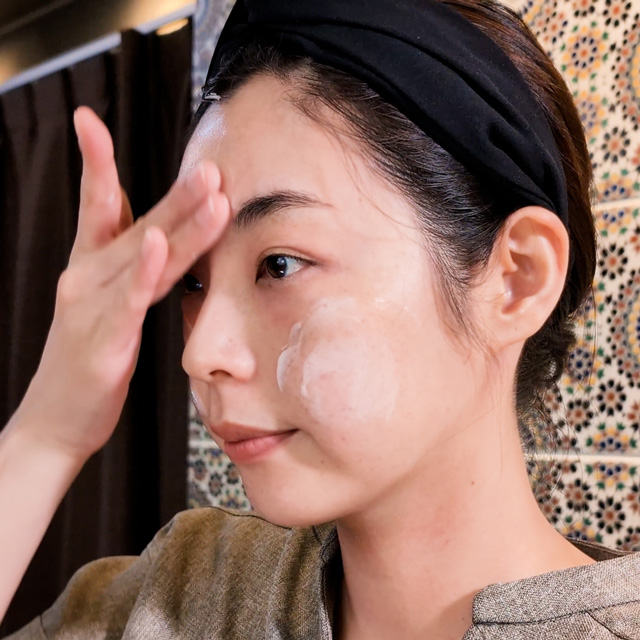 皮脂線の多いおでこや鼻を中心に、お顔全体と首元に塗り広げます